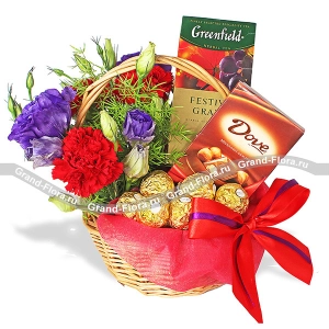 Пестрые мечты - букет из красных гвоздик и хризантемы