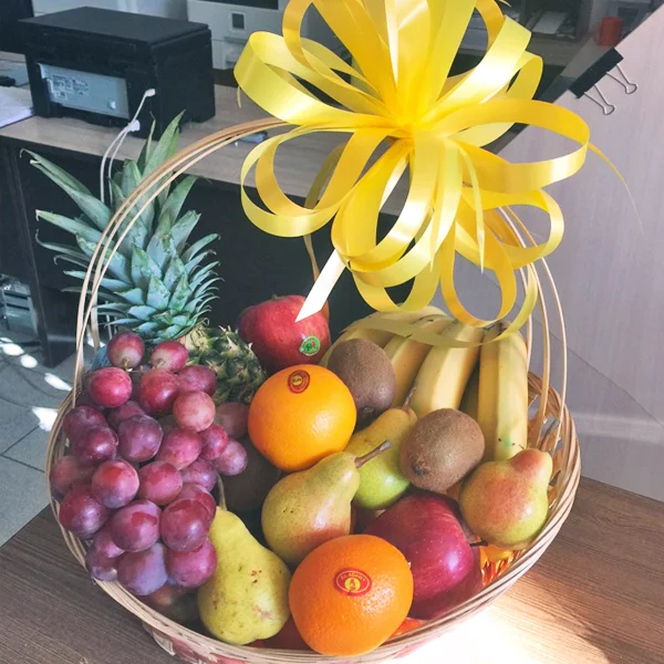 Люкс: ананас - 1 шт., яблоки - 1 кг., виноград - 1 кг., апельсины - 1,5 кг., киви - 5 шт., груши - 1 кг., бананы - 1 кг., корзина, бант желтый.