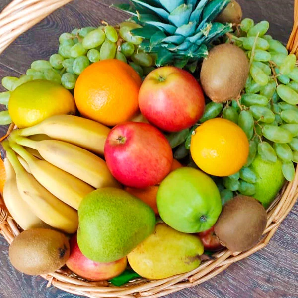 Стандартный: ананас - 1 шт., яблоки - 0,7 кг., виноград - 0,7 кг, апельсины - 1 кг., киви - 3 шт., груши - 0,5 кг., бананы - 0,7 кг., корзина, бант желтый.