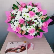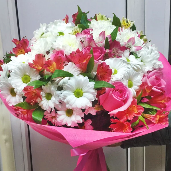 ЛЮКС: роза розовая - 9 шт., хризантема кустовая ромашковая белая - 7 шт., альстромерия розовая - 9 шт., фетр розовый, бант розовый.