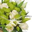Уменьшенный: роза белая - 3 шт., лилия белая - 1 шт., хризантема одноголовая зеленая (шамрок) - 5 шт., сетка коричневая.