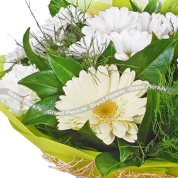 Стандартный: гербера кремовая - 5 шт., гвоздика белая - 4 шт., хризантема кустовая белая - 2 шт., декоративная зелень, фетр зеленый, сетка натуральная, бант кремовый.