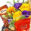 ДЕЛЮКС: Snikers - 5 шт., Mars - 3 шт., Twix - 5 шт., конфеты "Ferrero Rocher" - 1 шт., шоколад "DOVE" - 1 шт., шоколад "Коркунов" - 1 шт., шоколад "Ritter sport" - 3 шт., конфеты "Lindor" - 1 шт., роза - 7 шт., эустома - 3 шт., герберы - 3 шт., декоративная зелень, оазис, декор, средняя корзина.