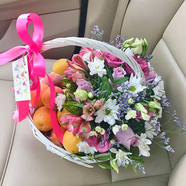 Стандартный: роза желтая - 3 шт., роза розовая - 2 шт., эустома фиолетовая - 1 шт., рускус - 2 шт., оазис, корзина средняя, абрикосы - 1,5 кг.