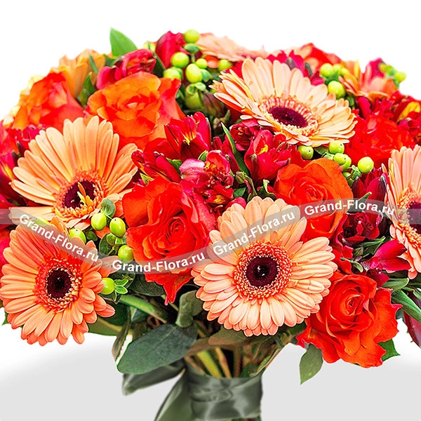 Стандартный: роза оранжевая - 5 шт., гербера оранжевая - 3 шт., альстромерия бордовая - 3 шт., гиперикум - 2 шт.,Упаковка крафт или фетр лента зеленая.
