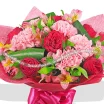 Роза красная - 15 шт, гвоздика розовая - 18 шт, альстромерия розовая - 14 шт, лист аспидистры загнутый - 9 шт, фетр красный.