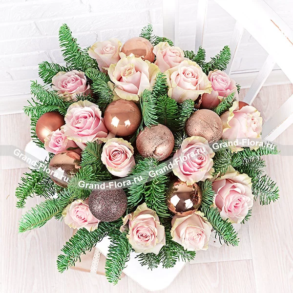 Стандартный: роза розовая - 7 шт., ель, шарики - 5 шт., оазис, коробка.