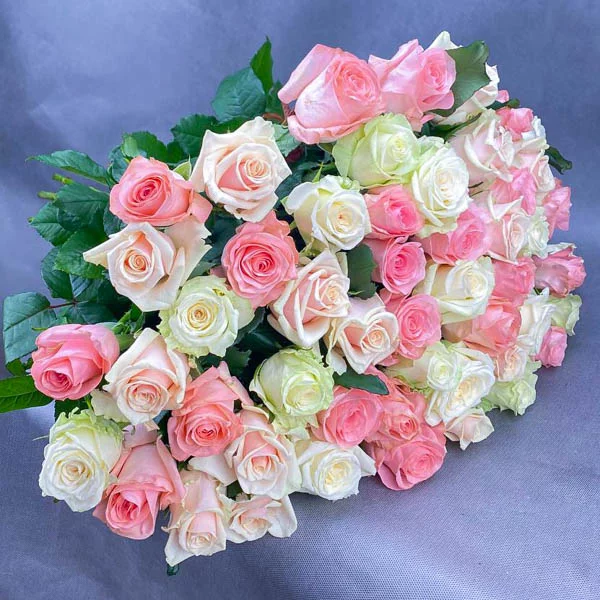 Роза белая (кремовая) и розовая (50-60см) - 101 шт , упаковка фетр. На фото представлен букет из 51 розы.